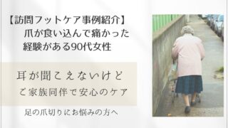 あしよし お客様 爪の食い込みにお悩み 90代女性 90代女性の巻き爪・肥厚爪ケア事例。娘さん同席のもと、定期的な訪問フットケアを実施。短時間でも痛みを予防し、安心して続けられる工夫をご紹介します。 2025.10.01 あしよし お客様お知らせフットケア