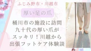 川越から桶川市の有料老人ホームへ出張。90代女性の肥厚爪・巻き爪をフットケアでスッキリ解消。「足が軽くなった!」と笑顔に。川越・ふじみ野市エリアで高齢者の爪切りにお困りのご家族へ。