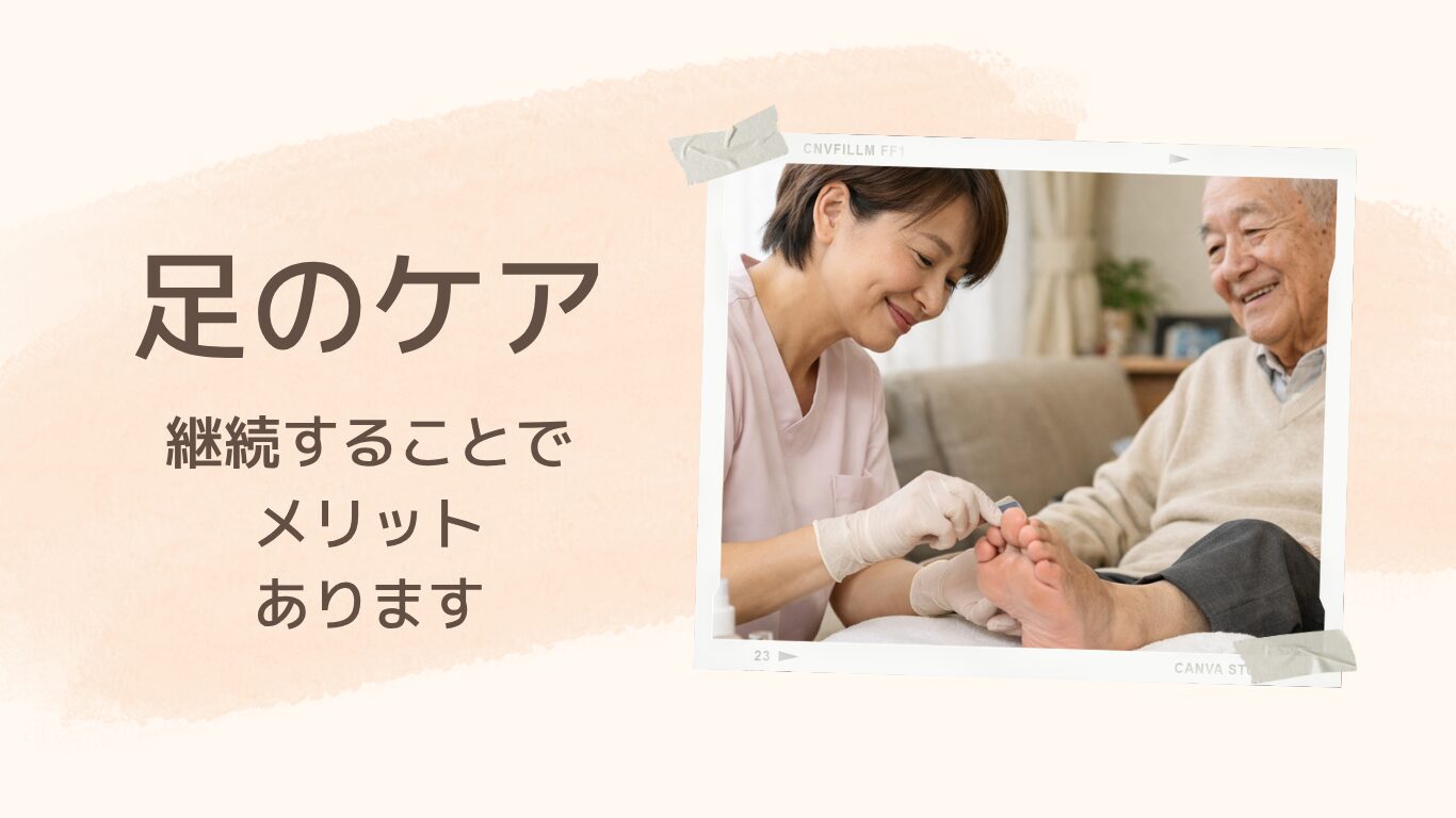 ケアを続けるうちに「今日は爪の色が違う」「ここが少し痛い」など、ご自身の足に目を向けるようになります。足を触る習慣がつくことで、小さな変化に早く気づけるようになります。