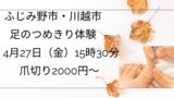 「訪問足ケアサービス あしよし」では、ご自宅や施設に伺い、爪切りや巻き爪ケア、足の健康管理をサポートしています。