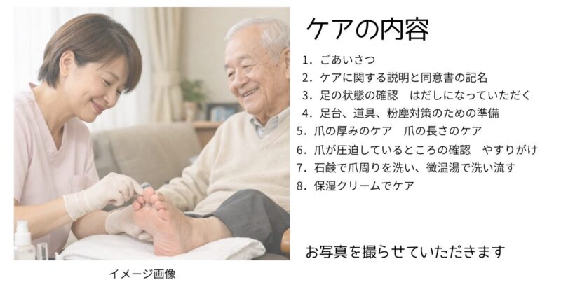 私たちは、ご自身で爪を切るのが難しいご高齢の方や、障害のある方のご自宅へ伺い、フットケア(足の爪切りや角質ケアなど)を行っています。